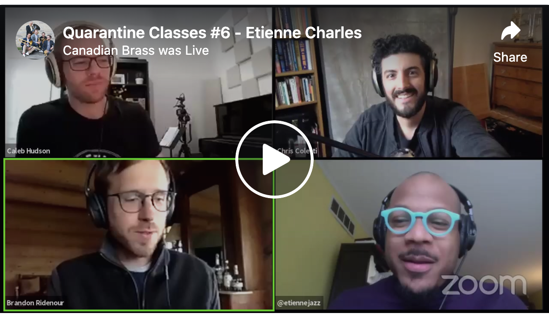 ETIENNE CHARLES, groundbreaking jazz trumpeter, recording artist, composer, arranger and Assistant Professor of Jazz Studies at Michigan State University, chats with me (Chris Coletti) and Canadian Brass trumpeters Caleb Hudson and Brandon Ridenour on Episode 6 of Quarantine Classes!